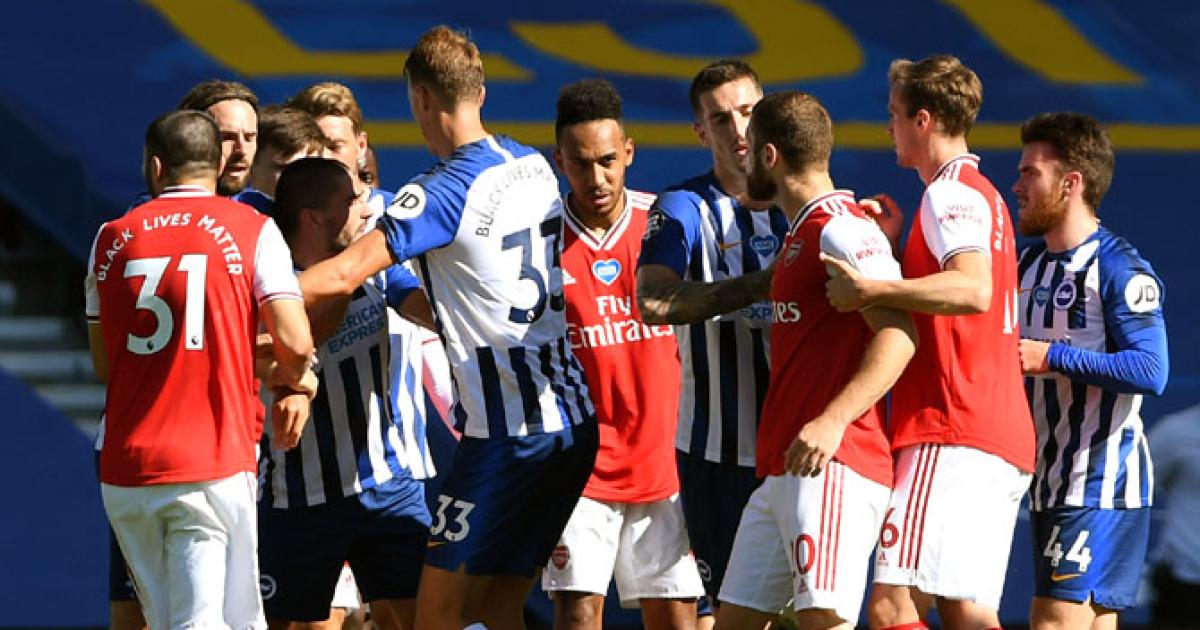 IMAGE: Players of Arsenal and Brighton & Hove Albion clash during the English Premier League match in Brighton, on June 20, 2020. Photograph: Mike Hewitt/Getty Images