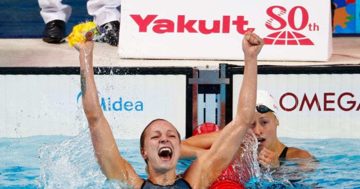 Sarah Sjostrom of Sweden celebrates after breaking a new world record of 55.74 in the Women's 100m Butterfly Semi-finals on day nine of the 16th FINA World Championships at the Aquatics Palace. Photograph: Clive Rose/Getty Images