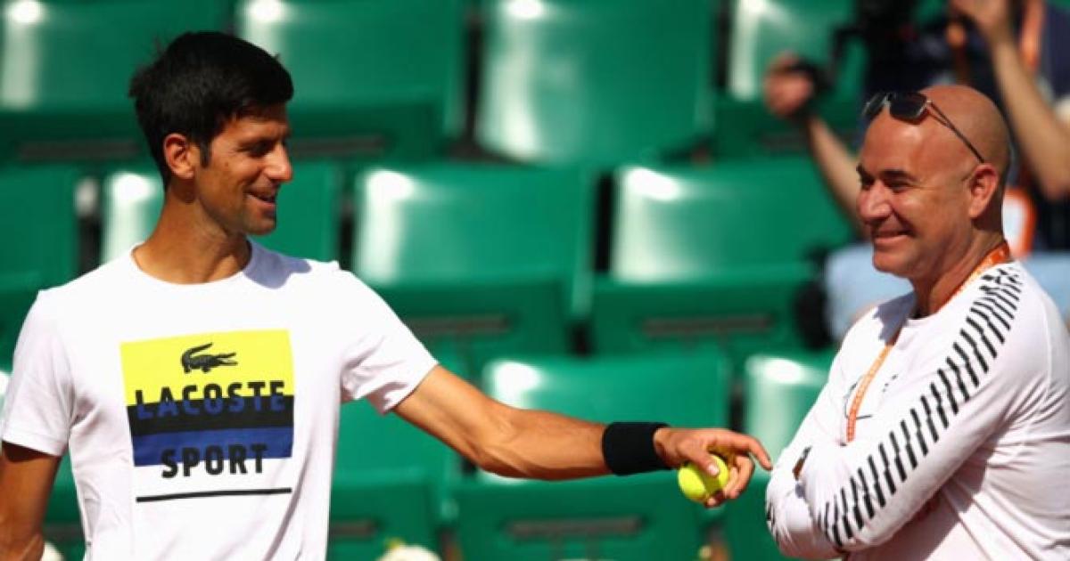 IMAGE: Novak Djokovic speaks to his coach Andre Agassi. Photograph: Clive Brunskill/Getty Images