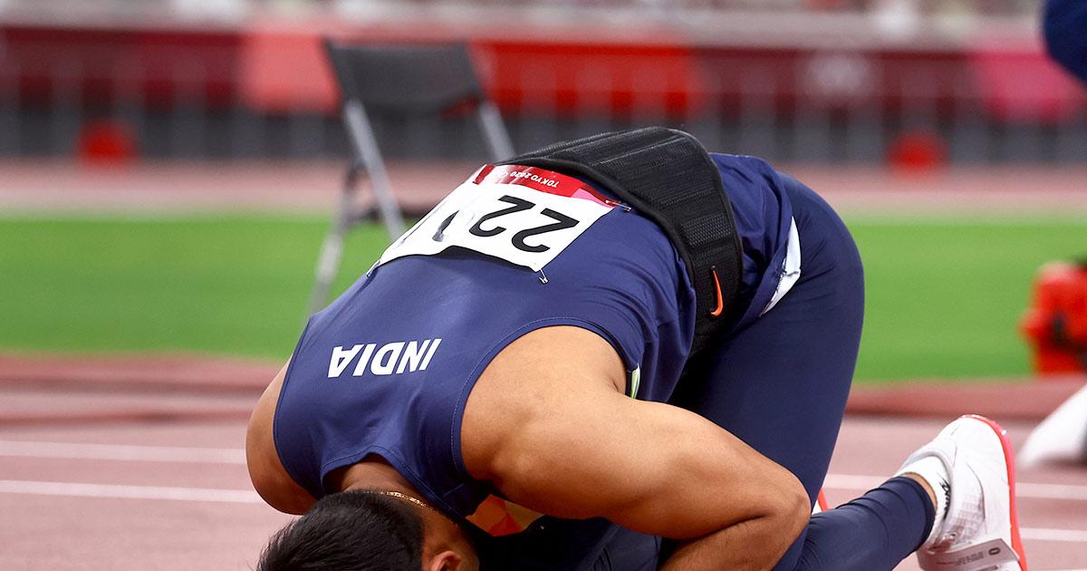 IMAGE: Neeraj Chopra celebrates winning Gold in the Javelin competition, ending India's 125-year wait for a track and field Olympic medal.