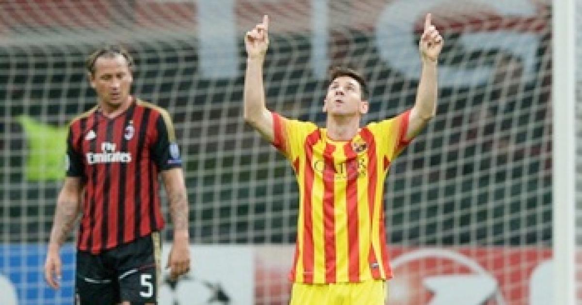 Image: Lionel Messi of FC Barcelona celebrates scoring the first goal during the UEFA Champions League Group H match against AC Milan, at Stadio Giuseppe Meazza on October 22, 2013 in Milan, Italy.