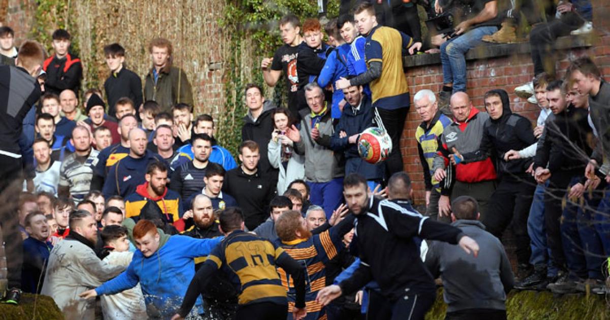 The Royal Shrovetide Football Match involves teams called the Up’ards and the Down’ards, who battle to try and tap the ball three times on stone plinths that act as goals.