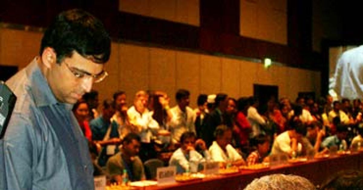 Anand, who played 35 mathematicians and five nominees selected by Infosys, was calm throughout the session. He moved from one opponent to another, making quick moves. The pace of his game was so fast that six of his opponents lost in less than 20 moves, while 33 of them resigned gradually over a period of three hours and 15 minutes.