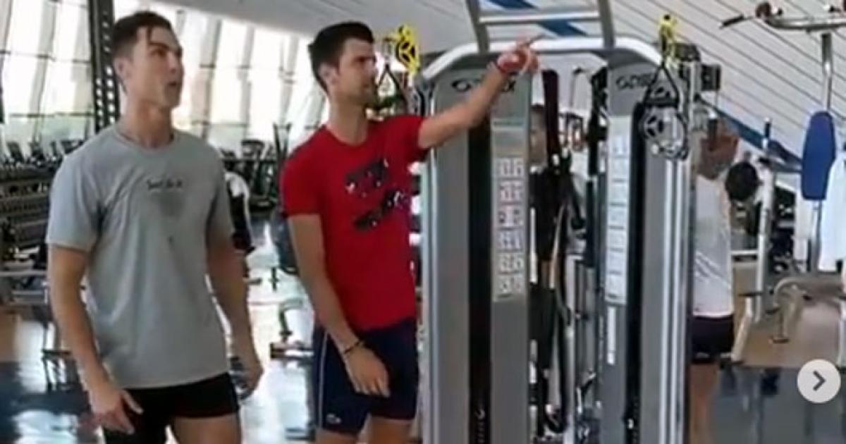 Ronaldo shared a video where he is seen teaching the world number two Djokovic how to jump high.
