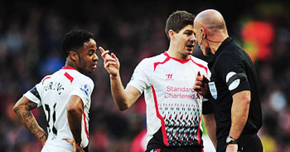 Image: Raheem Sterling (left) and Steven Gerrard (centre) of Liverpool talk with match referee Howard Webb during the FA Cup Fifth Round match against Arsenal in London on Sunday