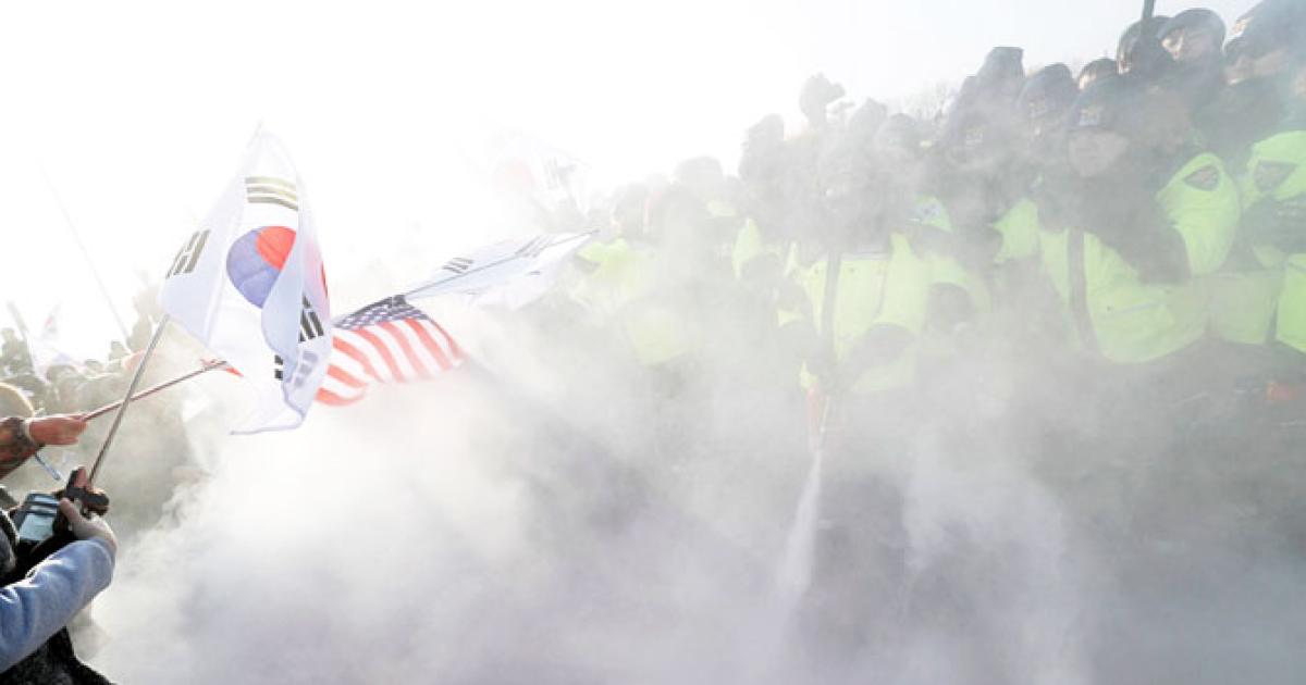 Protesters scuffled briefly with police and criticised South Korean President Moon Jae-in, who is using the Olympics to re-engage with the North and pave the way for talks over the reclusive state's nuclear and missile programme.