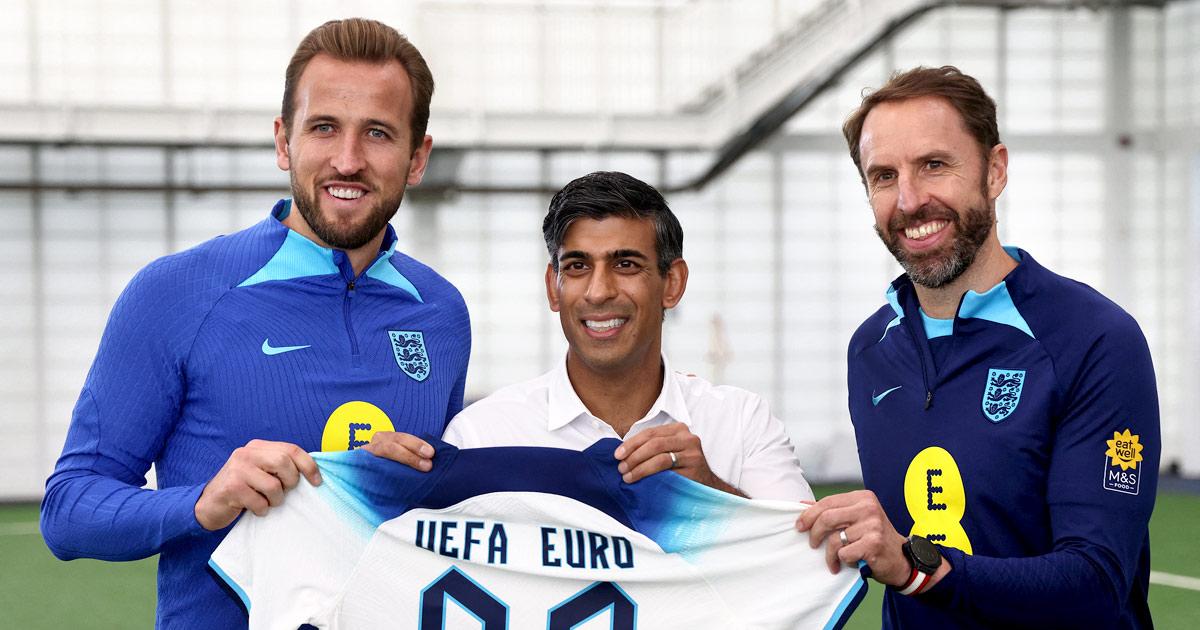 IMAGE: Rishi Sunak poses with England striker Harry Kane and England Manager Gareth Southgate. All photographs: Darren Staples/Pool/Reuters