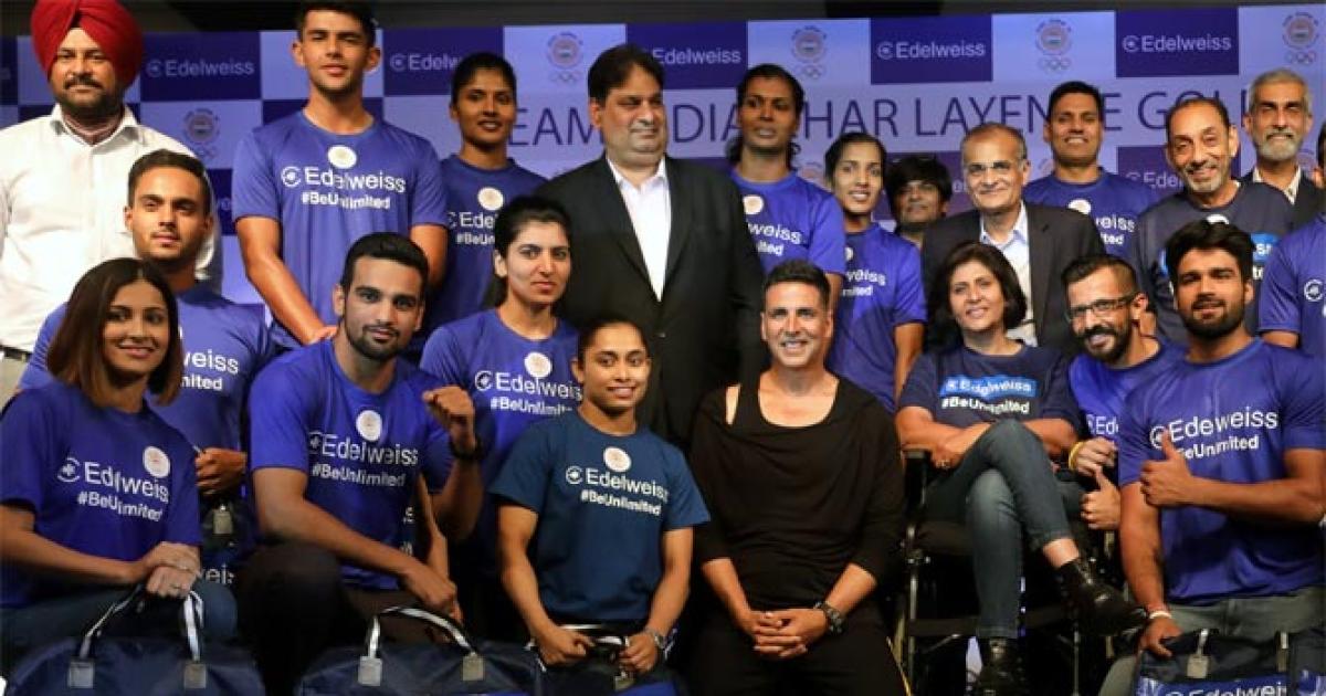 IMAGE: Bollywood superstar Akshay Kumar with the Asian Games and Para Asian Games bound India athletes during the India contingent send-off event in Mumbai last week.
