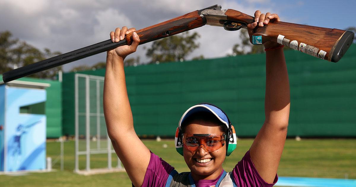IMAGE: Shreyasi Singh celebrates after winning the gold medal in the double trap finals at the 2018 Commonwealth Games in Gold Coast. Photograph: Phil Walter/Getty Images