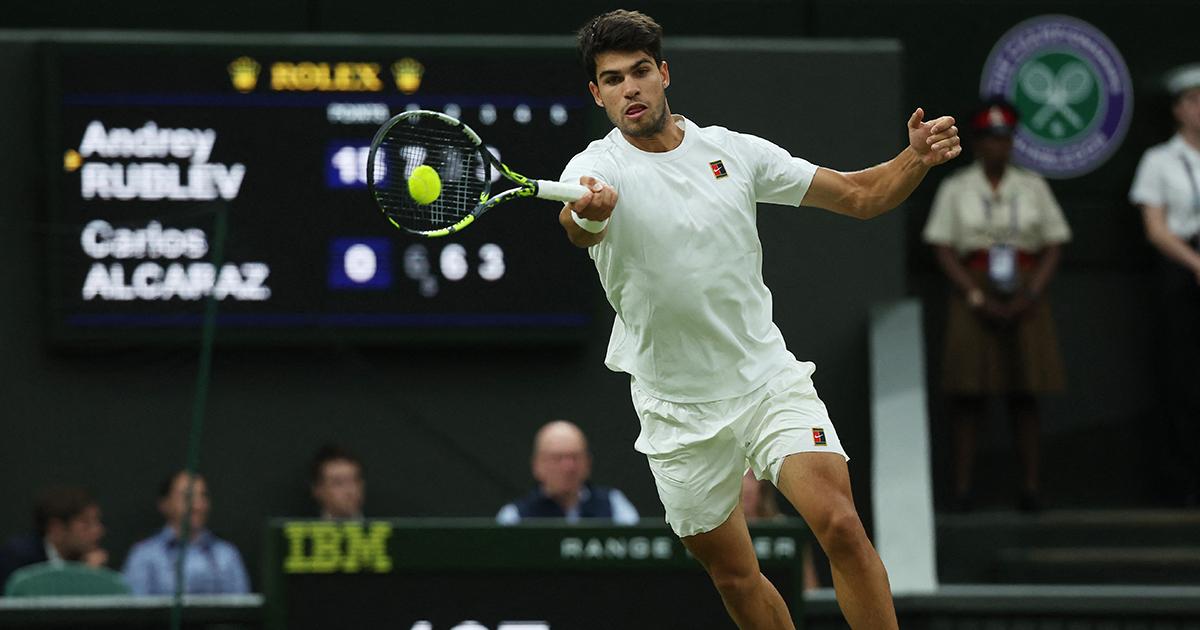 Carlos Alcaraz came through a ferocious fourth-round firefight against Andrey Rublev to win 6-7(5), 6-3, 6-4, 6-4 on Centre Court and keep his bid for a third successive Wimbledon title on track on Sunday.