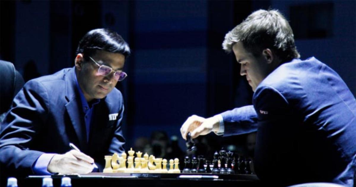 Image: Viswanathan Anand (left) in action against Magnus Carlsen.