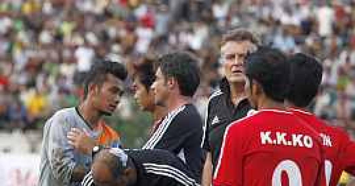 Oman's Ismail al Ajmi converted the spot kick to put his side 2-0 ahead after 39 minutes, sparking anger among the crowd at the Thuwunna Stadium and prompting players to flee for cover in the dressing room.