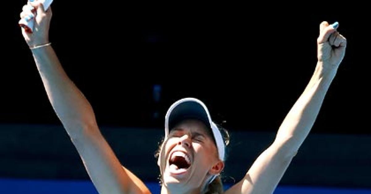 IMAGE: Caroline Wozniacki celebrates after defeating Elise Mertens in the semi-finals of the Australian Open on Thursday. Photograph: Scott Barbour/Getty Images