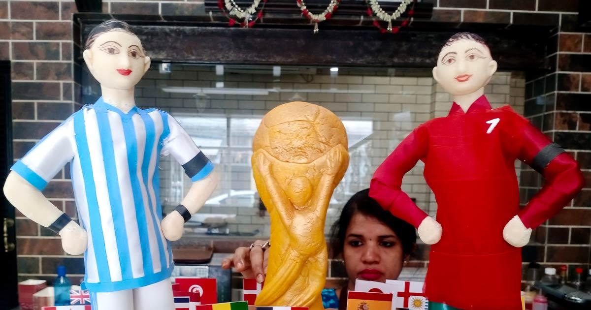 IMAGE: A confectioner in Kolkata displays confectionery created in the likeness of Cristiano Ronaldo and Lionel Messi on Sunday, the opening day of the FIFA World Cup 2022. Photograph: ANI Photo