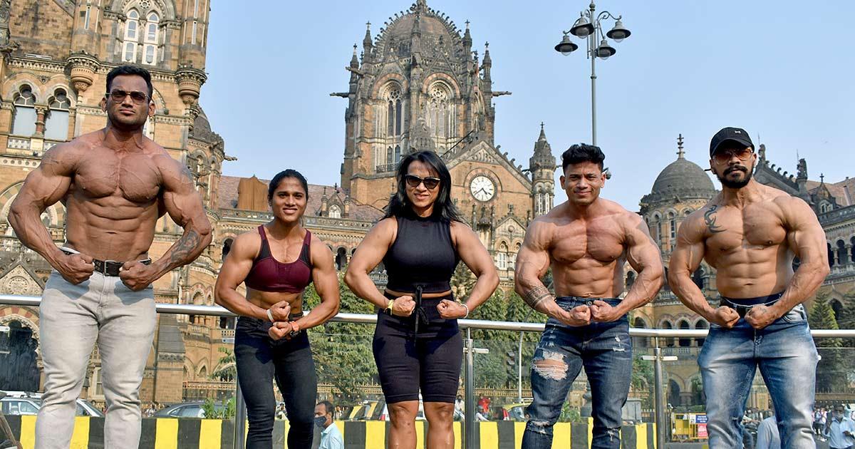 IMAGE: Bodybuilders pose for a picture in front of Mumbai's famed landmark, the Chhatrapati Shivaji Maharaj Terminus, during a press conference ahead of the International Federation of BodyBuilding and Fitness 'IFBB Mr and Ms Universe and Fitness Festival 2022' hosted by the Indian Bodybuilding and Fitness Federation, March 7, 2022.