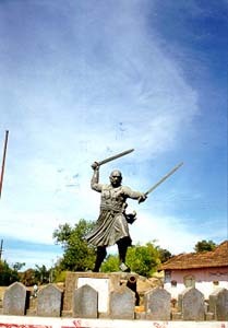 When supplies ran out, Shivaji fled to Vishalgad and the brave Deshpande stayed behind to face the Bijapur wrath. Ambidextrous, he fought valiantly with two 15 kilogram swords and died in the Battle of Ghodkhind. By that time, however, Shivaji had reached Vishalgad. History has it that Deshpande, dying of a fatal wound, didn't stop waving his sword till he heard the cannon boom that signified that Shivaji had reached safely. A 52 kilogram bronze statue was built in his honour and here I was standing in front of it. Vishalgad, 40 km away, is visible from Panhala fort. Panhala-Vishalgad is a popular trekking route. It takes trekkers 24 hours to reach Vishalgad. Shivaji however managed to reach the town in just sixteen hours seated in a palkhi or palanquin. There's another chapter to Shivaji's story. When Shivaji realised he could not hold the fort, he sent a message to Siddhi Johar that he was surrendering. A barber named Shiva Kashisth, who looked very much like Shivaji, dressed up like the Maratha chieftain and surrendered to Siddhi Johar. Johar's forces began to celebrate. His soldiers promptly went on a drinking binge. Shivaji slipped back and retook the fort a short while later. The barber, needless to say, did not survive. But there's a statue at Panhala honouring him too.
