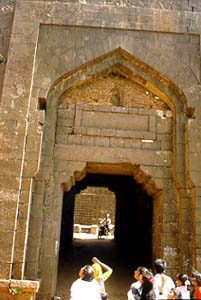 Like an anthill, the fort has several interesting secret underground channels. One of the passages stretches for a kilometre and a half. Not far away is the impressive Teen Darwaza or the Konkan Darwaza. Three doors, one behind the other, with twenty feet in between, prevented enemies from entering the fort easily. There is also a chor darwaza through which people could enter in the night on saying a particular password. Panhala is 3,127 feet above sea level. But there is no scarcity of water around here. Some seventy wells take care of that. Mullah guides me to one corner of the fort. A small insignificant tomb is located here. It belongs to the wife of Gangu teli. Apparently when Raja Bhoj had a problem constructing one of the walls of the fort, he took the advice of a sage. The sage declared that if a woman with a new-born child was sacrificed, the wall would not crumble. A public proclamation was made. Gangu teli, an oil vendor asked his wife Jakkuhai to step forward with her new-born child. And hence, this is her tomb, a special pilgrimage site for the teli caste. This little anecdote in history is the basis for popular Hindi saying -- Kahan Raja Bhoj, kahan Gangu teli -- that implies that the Raja Bhojs of this world will always gain and the Gangi telis will always be losers. Hence the difference between the rich and the poor.