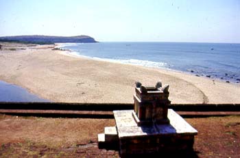 As you emerge through the trees and fields, and negotiate the final gentle plateau, a breathtaking view of the ocean dashing on the rocks below awaits you. The sight of -- ramparts of the ruined fort snaking downwards, rugged cliffs reaching out to sea and the lighthouse with two ancient temples nearby -- completes a truly stunning sight. The gentle chugging of a passing fishing trawler only adds to the beauty of the scene. I fervently wish that the construction of the project nearby does not, in any way, disturb this pristine scenery.