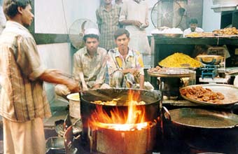 Abu Hasan Chacha, who sits there, ladling delicious malpuvas from giant woks of hot oil, has been effortlessly preparing these golden, deep-fried pancakes for the past 20 years. And believe me, Uncle, knows how to make them. These fragrant, piping hot sweetmeats, made from rawa (semolina), flour, sugar, eggs and yeast, are pretty heavy on the stomach. I doubt if one person would be able to wolf down an entire malpuva, especially after all the khiri-kaleji and fried chicken you may have eaten at the stalls facing the sweet shops. Janata Chicken 65 Stall is a great place to eat khiri-kaleji (crispy masala fried udders and heart), gurda fry or (kidney and liver dry fried with red or green masala), chicken fry, masala dry fried bater or quails or bheja fry (masala brain). Don’t ask what 65 stands for. Even the owners don’t know what it means. The Minara Masjid neighbourhood attracts a rather eclectic crowd. You may be breaking bread, or rather tearing pau, with well to do families, from the high rises of Colaba, Cuffe Parade or Peddar road, or just as easily with the odd phirang (tourist) trying out the tava dishes. That is one of the reasons why Ramzaan fare near the Minara Masjid has become more expensive. It would be a good idea to be sure of what you are ordering and how much it costs. Better safe than conned! Even if your stomach is full. Don't miss snacking on the mango or saadi firni or the khaja (white flour pastry) while you hang around. Another delicacy is the santhal, which is a speciality of the Memon women who prepare it from rice and mawa. Nagdevi street -- amongst the mohallas you would like to visit -- is the most difficult to navigate. Situated in the midst of the crowded Crawford Market area, Nagdevi street dishes out the best of baida-rotis, naan sandwiches and khiri kaleji. Tawakkal Tandoori Centre is the place to head for. Interestingly it is owned by the three brothers, who inherited Bori Mohalla's famed Bara Handi restaurant from their father. Over a period of time they have expanded their repertoire and now serve Chinese food too! The three brothers handle the three stalls on a rotational basis; two years at each place. The nearby Badri Sweet shop is another great malpuva and firni haunt, not to forget their wonderful jalebis. Bori Mohalla is the last of the mohallas, located beyond Minara Masjid. To get here, take a right out of the Minara Masjid lane. On your way to Bori Mohalla you will pass the famous Noor Mohammedi Nalli Nihari restaurant. Stop in and have a bite of their famous mutton marrow curry, served with naan; a fairly decent restaurant, even though it is a Grade II eating-house. Bori Mohalla is the home of the famous Bara Handi Hotel (restaurant), right across from the tomb of the late Bohra leader, Syedna Tahir Saifuddin Saheb. Bara Handi... Twelve different handis or cauldrons of beef or mutton salans and kormas (curries) -- ranging from chote ka paya (mutton trotters curry) to pichota (tail curry) or bade ka paya (beef trotters curry) – are available. Very oily, moderately spicy… yet delectable. You can choose to eat three, four of them together with naan or one at a time. All weight watchers should abstain. Once you are tucking into Bara Handi delicacies, you can’t help throwing caution to the winds. Bara Handi, like many of the other stalls and eateries mentioned, serves up its 12 curries all year round, but for Ramzaan it always has a few special curries, as does the entire locality.