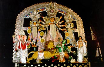 which are constructed from cloth or Plaster of Paris, are often modelled on famous Indian temples.