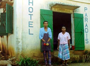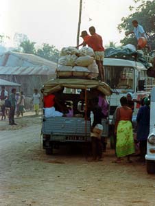 But Madagascar found me being drawn almost involuntarily to the difficult -- for me -- over the easy, the hard knocks over the cushy travelling. I still don't know why. But as a result, I had a far better appreciation of the country. It was as if I was throwing my whole relatively comfortable life till then up against the challenge of the hike across Masoala. We got into a bus to take us to the beginning of the trail. It promptly spent the next three hours roaming up and down Sambava's one main road, looking for passengers. Not for the first time, I learned my lesson about transport in Madagascar: scheduled times mean nothing. Theophile befriended a passenger in the bus from a village some hours along the trail: Theogene. Theogene was returning from town with some supplies. I looked at them -- tooth brushes, a notebook, some pens. What I might have run down to the corner paanwalla for, Theogene had spent three days on foot and bus getting. And he was still several hours walk from home. It took my breath away. More so when Theophile told me he had asked Theogene to join us, so that he (Theophile) would have company on the way back. As simply as that, Theogene had agreed to at least another week's worth of walking. As soon as Theogene had decided to join us, he shot off down the trail at twice our speed. I found out why when we trudged into his village late that afternoon. He had made us lunch: scrambled eggs and steaming heaps of rice with a thin gravy of small green leaves boiled in water. It was a wonderful meal, not least because it came of Theogene's simple affection.