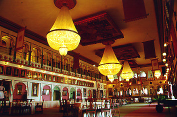 Blue, cream and gold. Oval panes. Brocade curtains. Saffron turbaned