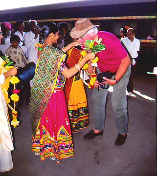 staff. Steam engines. Red carpetted, marigold garland reception.