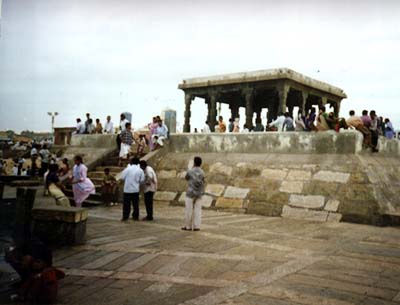 The path to the waterfront is lined with shops. There was the customary tea shop, run by a Tamilian who spoke with a Malayali accent. Reminded me that Kerala was barely an hour's drive away. The Keralites claim that Kanyakumari actually belonged to them and the Tamilians had cheated them out of their due. Kanyakumari, I believe, actually belonged to the Raja of Travancore. There were electronic shops, handicraft shops, shoe shops, cloth shops and bangles shops. The tourists crowded the handicraft shops and while the ladies peeped into the bangle shops. My sisters were eyeing the handicrafts as I pushed them towards the beach. The shops ended at the gate of the Kanyakumari temple. You could see the presiding deity from the entrance. Many people, on their way to the sea, prayed at the entrance. The beach was crowded. The waves were choppy. Two people were bathing in the sea, though the waves looked very dangerous. To our left, we could see a jetty from which small boats were taking tourists to the Vivekananda rock memorial.